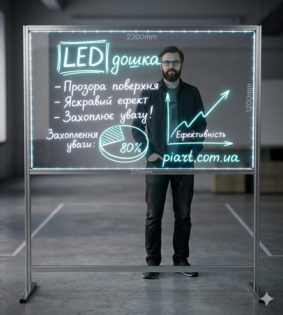 Утримання уваги за рахунок незвичайної подачі. Презентації та демонстрація екрану вже не привертає увагу! Виділяйтеся із загального потоку. LED дошка з флуоресцентними маркерами – можливість привернути увагу й утримати аудиторію.